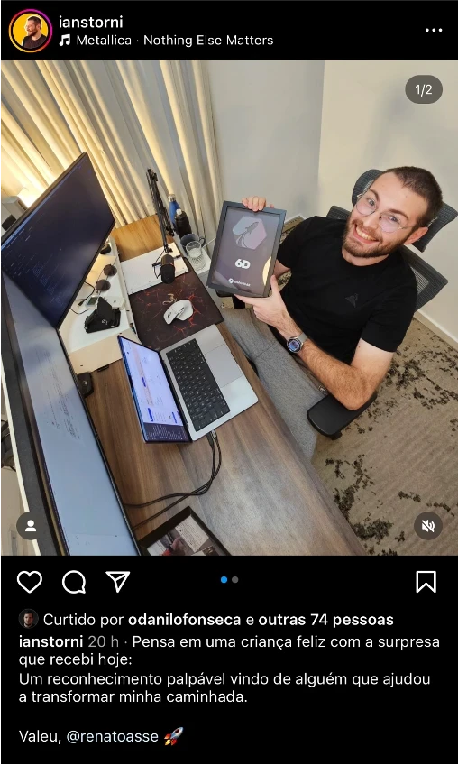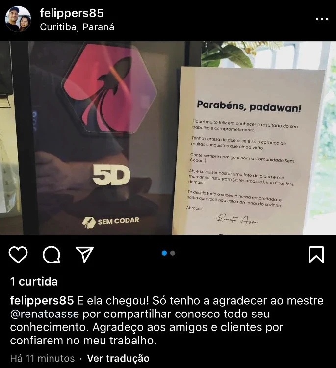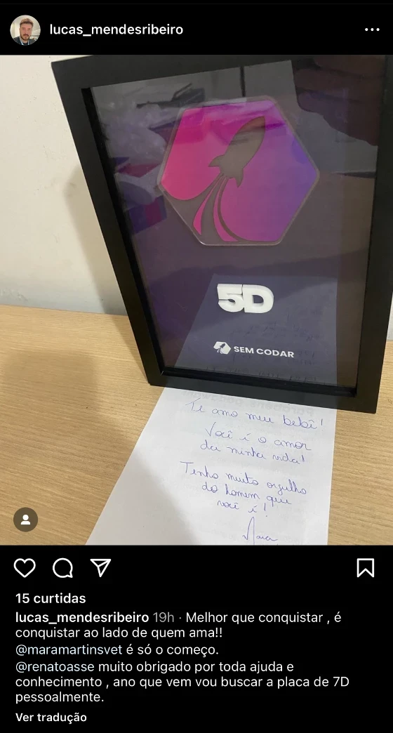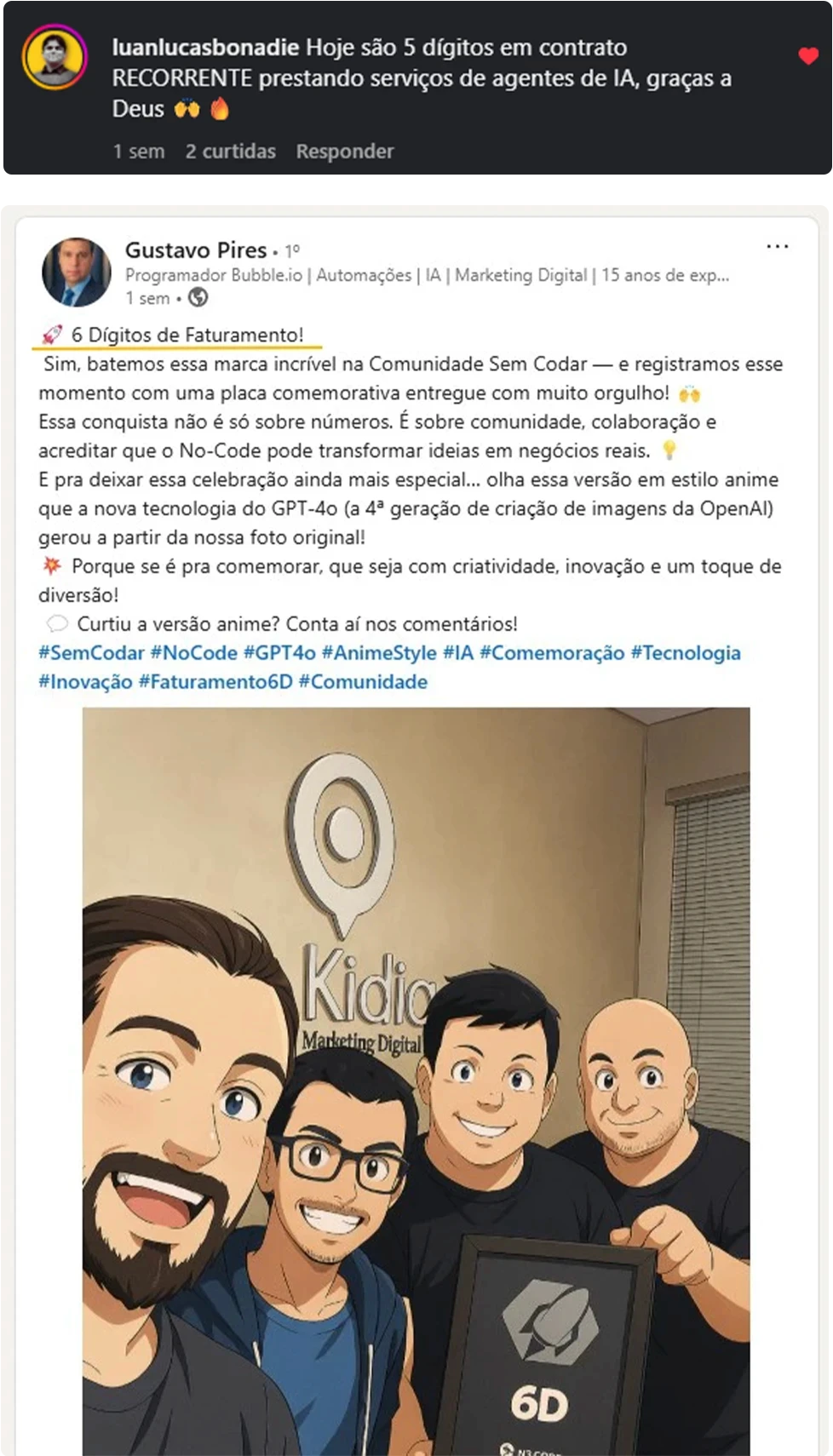 Centenas de alunos já receberam suas placas comemorativas 5D (mais de R$10 mil faturados), 6D (mais de R$100 mil), e 7D (mais de R$1 milhão), desenvolvendo Agentes de IA e Aplicativos.